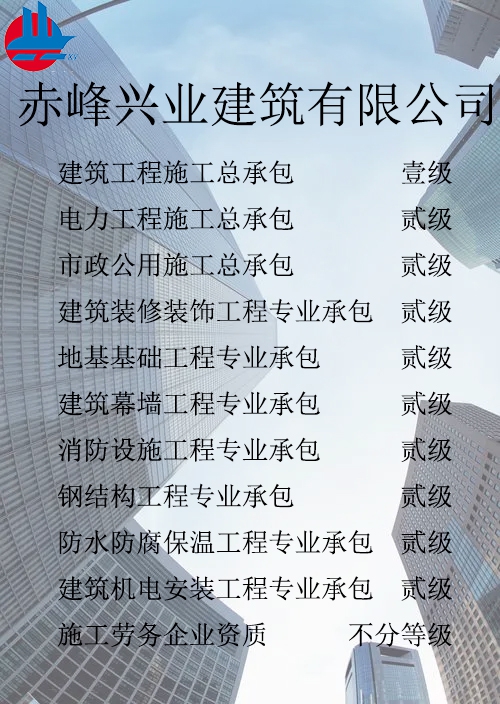 赤峰興業(yè)建筑有限公司簡介 赤峰興業(yè)建筑有限公司成立于1998年7月,位于內(nèi)蒙古赤峰市松山區(qū)?,F(xiàn)已發(fā)展成為擁有建筑工程施工總承包壹級、電力工程施工總承包貳級、市政公用工程施工總承包貳級、承裝、修、試四級、?建筑裝修裝飾工程專業(yè)承包貳級、建筑幕墻工程專業(yè)承包貳級、消防設(shè)施工程專業(yè)承包貳級、地基基礎(chǔ)工程專業(yè)承包貳級、鋼結(jié)構(gòu)工程專業(yè)承包貳級、建筑機電工程專業(yè)承包二級、防水防腐保溫工程專業(yè)承包貳級以及建筑施工勞務(wù)等資質(zhì)的綜合性建筑施工企...